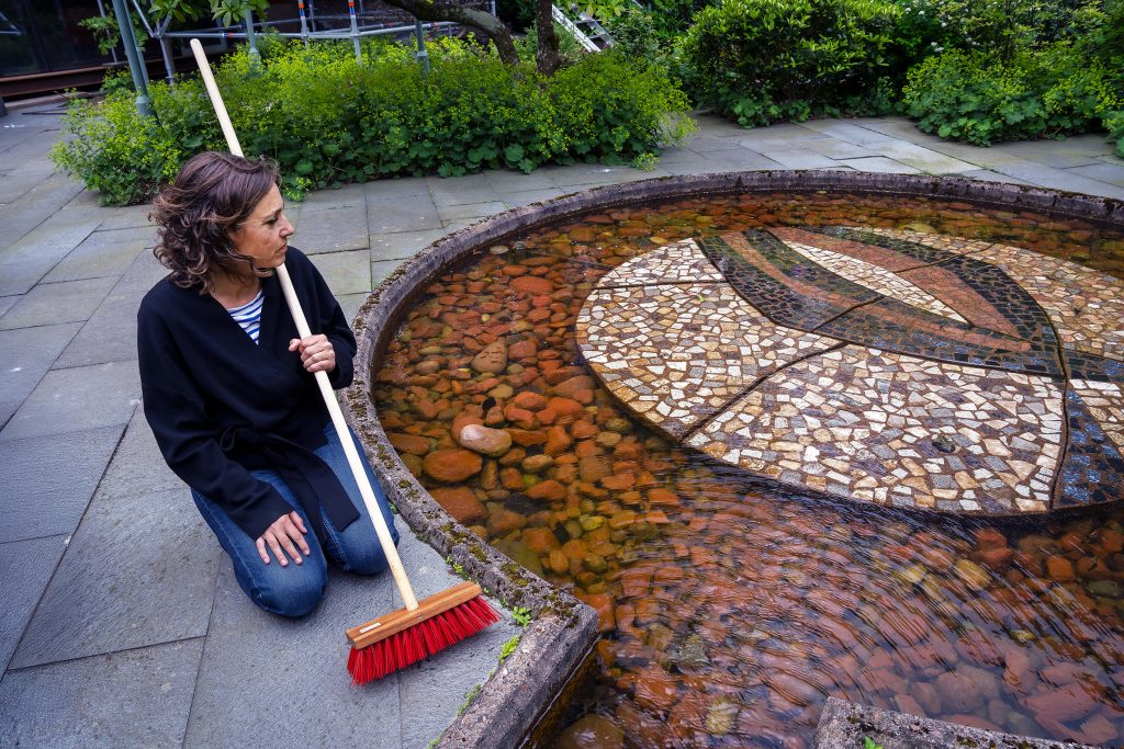 När de besöker mosaiken märks det att det var ett tag sedan den rengjordes, men väktarna på Östra sjukhuset hjälper till med att hitta en kvast och Linda Wallander gör sitt bästa att få bort alger och annan smuts som har ansatt den.