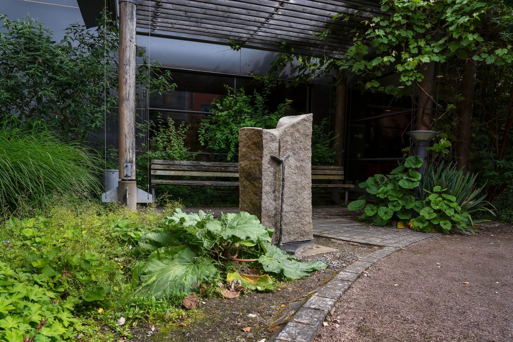 – Jag har fönster mot en av de här gårdarna, men har inte tänkt på att det finns skulpturer här, säger Pierre Lindeblad, vårdenhetschef på verksamhet Beroende, som öppnar dörrarna till innegårdarna vilka i vanliga fall endast patienter och medarbetare har tillgång till.