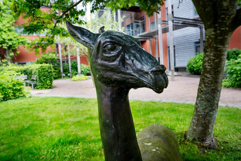 Inspirationen till skulpturen kommer från när konstnären besökte Kolmården och en lama stack in huvudet i bilen. Det blev ett fint möte som hon ville återskapa. När den skapades gick Leena till Naturhistoriska museet och tecknade av deras uppstoppade exemplar för att få till rätt uttryck.