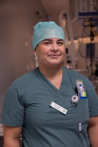 Veronika Sekeres är undersköterska och har jobbat i operationssalarna på Östra sjukhuset i drygt fem år. På frågan vad hon har för arbetsuppgifter svarar hon först med ett ”Oj!”. Det kan vara att hjälpa till vid sövning, assistera operationssjuksköterskan, ta upp sterilt material, ställa i ordning i salen, att rätt apparatur är på rätt plats eller att dokumentera i datorn. Se till att patienten ligger bra på bordet och att det inte finns risk för trycksår. Exemplen är många. Men hon är samtidigt van vid en hel del väntan.